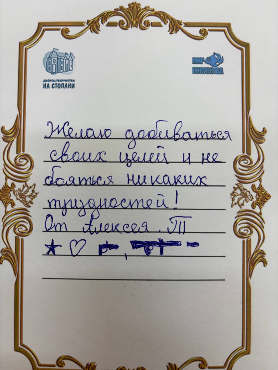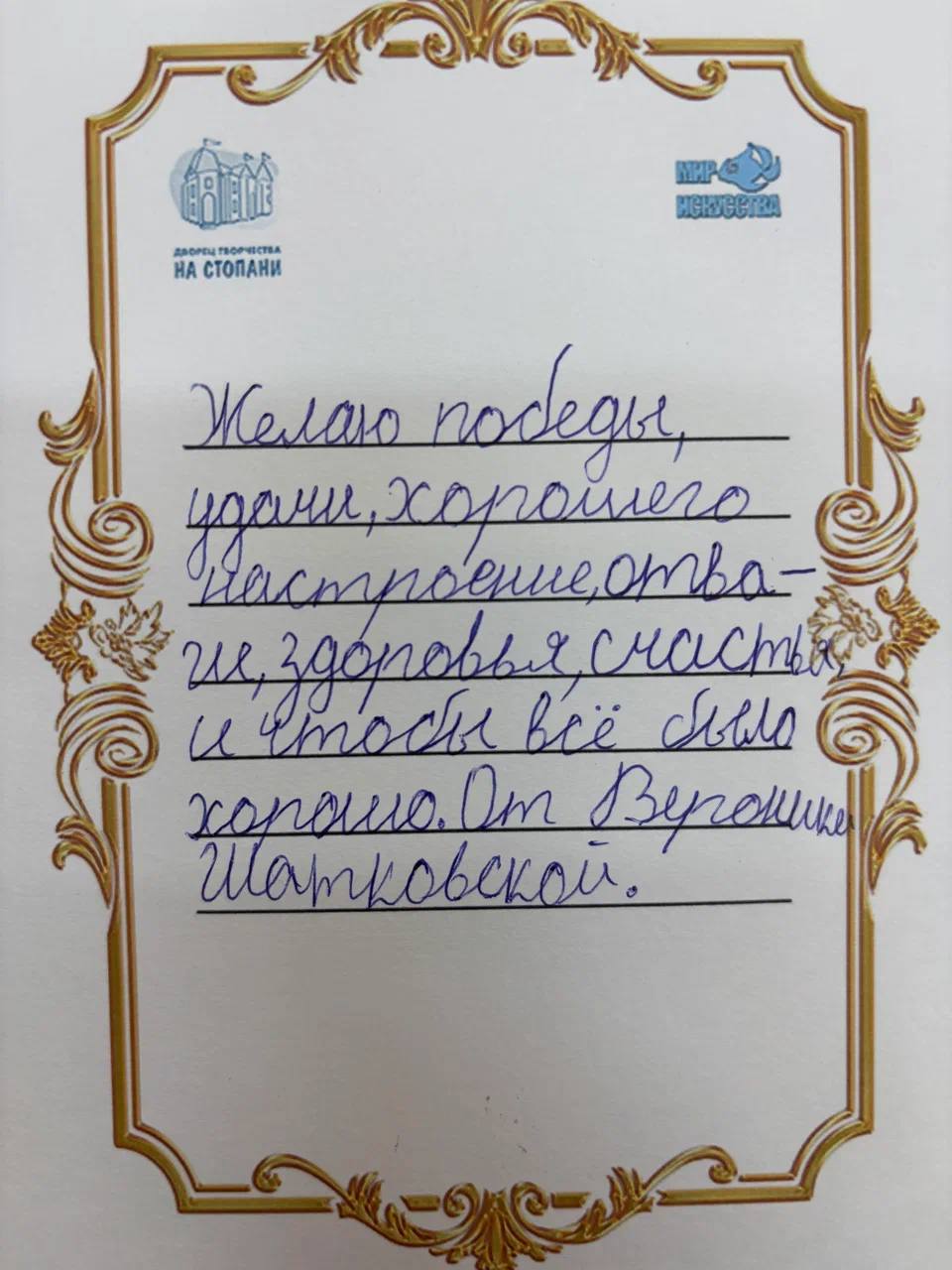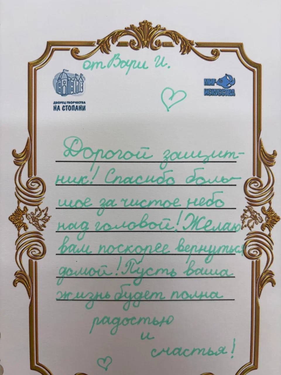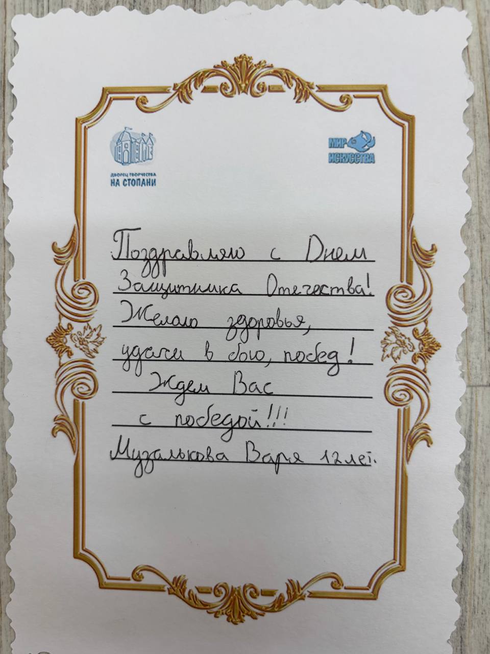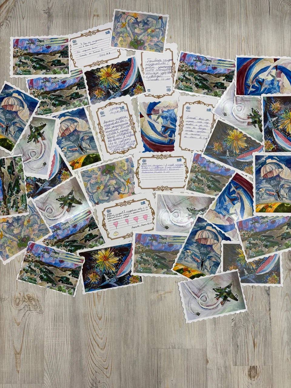Юные художники студии «Мир искусства» нарисовали тематические картины, которые легли в основу поздравительных открыток, а обучающиеся остальных коллективов подключились и подписали открытки. Добрые слова, искренние пожелания и надежда на Победу — все это звучит от детей и родителей. Мы очень надеемся, что эти письма доставят нашим защитникам радость и вдохновение. Мы вместе!