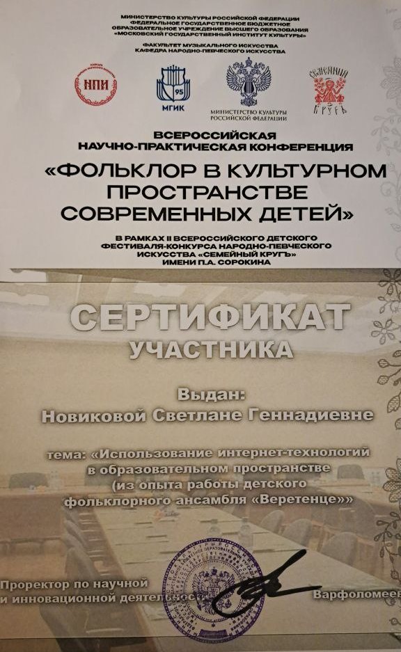 28 ноября педагог детского фольклорного ансамбля «Веретёнце» Светлана Геннадиевна Новикова приняла участие во Всероссийской научно-практической конференции «Фольклор в культурном пространстве современных детей», которая состоялась в Московском государственном институте культуры в рамках II Всероссийского детского фестиваля-конкурса народно-певческого искусства «Семейный кругъ».
